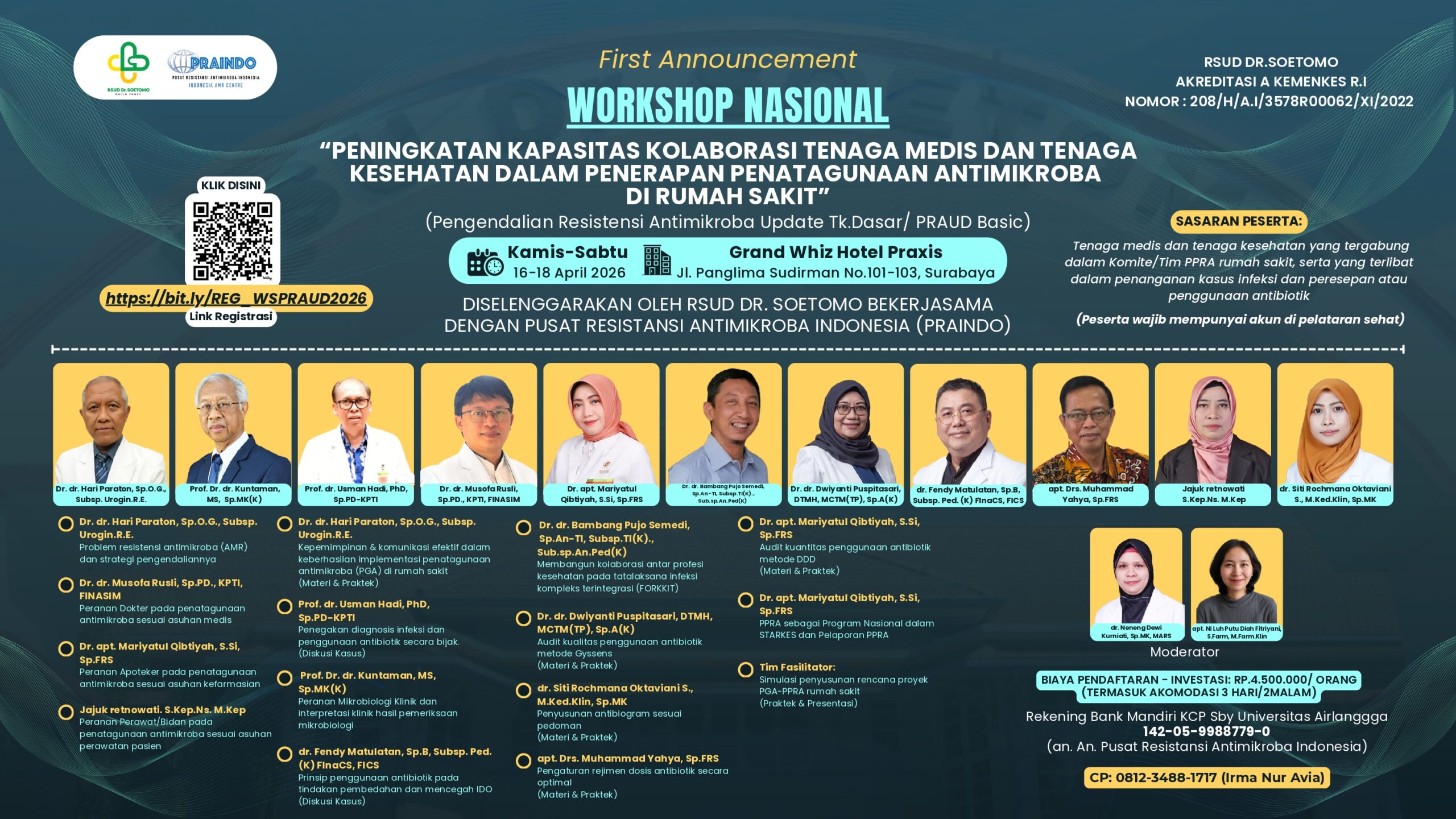 - Webinar Nasional: Clinical Best Practices – Pencegahan Infeksi Pasca Tindakan OperasiDalam rangka World Antimicrobial Awareness Week (WAAW) 2025, RSUD Dr. Soetomo bekerja sama dengan Pusat Resistensi Antimikroba Indonesia (PRAINDO) menyelenggarakan… Baca Selengkapnya: Webinar Nasional: Clinical Best Practices – Pencegahan Infeksi Pasca Tindakan Operasi